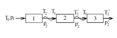 , т.е. что температура газа в конце процесса сжатия в каждой ступени одинакова, и что работа сжатия в каждой из ступеней компрессора одинакова, т.е. l 1= l 2= l 3= lц /3, где 3 – число ступеней компрессора в рассматриваемом примере. Каждая ступень работает в одном и том же интервале температур от Т 1 до Т 2, как показано на следующей схеме: