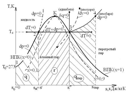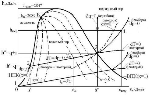 На паровой диаграмме «h-s» критическая точка «К» сдвинута влево и вниз по отношению к вершине, так как энтальпия «hк» в критической точке не является максимальной величиной. Так для воды