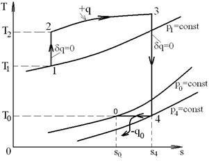 Процесс 4-0 – изотермический процесс, приводящий давление р 4 к давлению р 0. В процессе 4-0 теплота q 0 отдается окружающей среде.