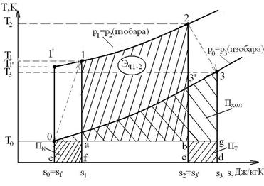 где 0-1 - процесс сжатия газа в компрессоре; 1-2 - процесс подвода теплоты; 2-3 - процесс расширения газа на турбине; 3-0 - охлаждение газа в холодильнике.