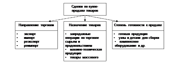 | Сделки по купле-продаже товаров можно классифицировать по различным критериям. 1 критерий - направления торговли. По данному признаку различают экспортные, импортные, реэкспортные и реимпортные запродажные внешнеторговые контракты. Экспортные операции направлены на вывоз товаров за пределы государства. Импортные операции связаны с ввозом на внутренний рынок товара, закупленного у другой страны. Реэкспортные операции - продажа с вывозом за границу ранее импортированного и не подвергшегося переработке товара. Обычно эти операции возникают из-за резкого изменения международной обстановки, отсутствия прямых экономических и дипломатических связей между странами, возникновения военных действий. Реимпортные операции - приобретение с ввозом из-за границы ранее экспортированного и не подвергшегося там обработке товара. К таким операциям относятся виды возврата: • бракованной продукции; • товаров, не реализованных посредником на рынке; • товаров, ранее поставленных на консигнацию. 2 критерий классификации операций по внешнеторговой купле-продаже товаров - назначение товаров. Здесь выделяют несколько групп (см. рисунок). Основную часть экспортных поставок России составляют сырьевые и продовольственные товары. По формам международной торговли сырьевые товары делятся на биржевые (зерновые, сахар, натуральный каучук, хлопок, цветные металлы) и небиржевые (природный газ, уголь, руды, черные металлы и др.). 3 критерий классификации - степень готовности товара к продаже. По данному признаку различают: поставку готовой продукции, узлов и деталей для сборки, комплектного оборудования и т.д. |