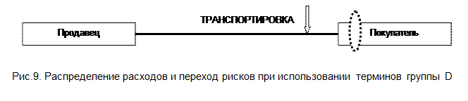 Если применяются остальные термины этой группы, то поставка осуществляется продавцом в место назначения, и он несет риск потерь и повреждения на всем пути следования товара (рис. 9). При этом термины DES и DEQ используются только на морском и речном транспорте. Их отличие заключается в том, что в первом случае продавец не оплачивает выгрузку, а во втором оплачивает. Остальные термины применяется на любом виде транспорта.