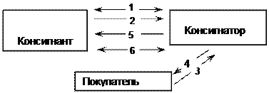 На рис.1.16 представлено взаимодействие сторон, участвующих в договоре консигнации. На этом рисунке обозначено: