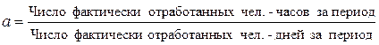 Числитель (а) – это среднее число часов, отработанных одним среднесписочным работником за день (различают полную продолжительность рабочего дня и урочную – разность их коэффициентов показывает, какая часть неиспользуемого внутрисменного времени в среднем ежедневно компенсируется за счет сверхурочных работ):