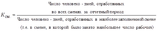 Коэффициент сменности (показывает, сколько смен в среднем в течение суток могло работать предприятие при равномерной загрузке смен рабочей силой, т.е. в каждой смене занято столько людей, сколько работает в наиболее заполненной смене):