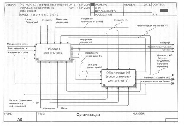 Построенный на основе методологии IDEF0 рис. иллюстрирует общую модель структур и связей деятельности в области ИБ и основной деятельности организации.