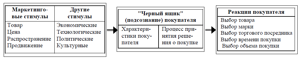 Характеристики покупателя – факторы культурного, социального, личного и психологического порядка, оказывающие большое влияние на потребителя при совершении покупки. Маркетологи стремятся понять, каким образом в «черном ящике» потребителя происходит превращение стимулов в реакцию. «Черный ящик» сознания покупателя - это набор определенных стимулов внутреннего и внешнего характера, под воздействием которых происходит принятие решения о покупке, он состоит из двух частей: