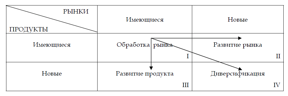 | Развитие рынка – освоение новых рынков с помощью старых продуктов, основная цель - рыночная экспансия. | Сбыт на новых региональных, национальных или интернациональных рынках (интернационализация и глобализация); новые области применения для старого продукта. |