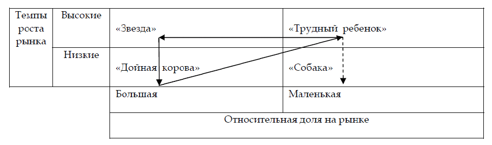 Модель «Доля рынка – рост рынка» (матрица Бостонской Консалтинговой Группы - БКГ). В матрице БКГ в качестве координат берутся показатели относительной доли рынка и темпов роста отраслевого рынка – рис.14.7.