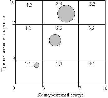 3. Определение позиции товара. Модель GE имеет вид матрицы размером 3х3 (рисунок 14.9). По осям У и Х выставляются интегральные оценки, соответственно, привлекательности рынка и конкурентного статуса организации на соответствующем рынке. Анализируемые объекты отображаются на сетке матрицы в виде кружков, или "пузырьков", центры которых однозначно задаются полученной на первом этапе оценкой привлекательности рынка (ось У) и полученной на втором этапе оценкой конкурентного статуса (ось X). Каждый кружок соответствует общему объему продаж на некотором рынке.
