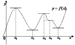 Точки, в которых функция достигает максимума или минимума, называются точками экстремума функции, а значения функции в этих точках называют экстремальными.
