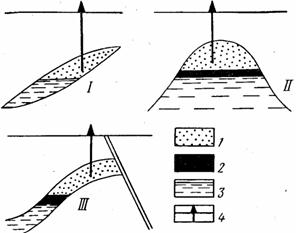 I – изолированная линза, II – массивная залежь с гудронизированной (окисленной) зоной на водонефтяном контакте, III – то же пластовая залежь, 1 – нефть, 2 – гудрон, 3 – вода, 4 – скважина