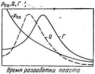 По мере снижения пластового давления степень разрежения нефти возрастает; количество пузырьков газа в пласте увеличивается; одновременно увеличивается относительная проницаемость пласта для газа, а относительная проницаемость пласта для нефти резко уменьшается. В силу этого все большие количества газа проскальзывают к забоям скважин, не выталкивая нефть. Поэтому по мере разработки пласта газовый фактор будет возрастать сначала медленно, затем очень быстро.