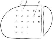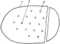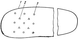 1 – условный контур нефтеносности, 2 и 3 – скважины соответственно нагентательные и добывающие