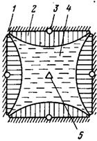 1 – «четверть» основных добывающих скважин пятиточечного элемента (угловые скважины), 2 – целики нефти (застойные зоны), 3 – дополнительно пробуренные добывающие скважины (боковые скважины), 4 - заводненная область элемента, 5 - нагнетательная скважина