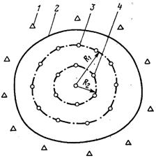 1 – нагнетательные скважины, 2 – условный контур нефтеносности, 3 и 4 – добывающие скважины соответственно первой батареи радиусом R1 и второй батареи радиусом R2