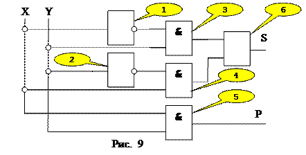 | X | Y | (не X) | (не Y) | (Y и 1) | (X и 2) | (XиY) | (3или4) | S | P |