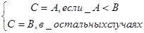 Как и в случае с линейным алгоритмом, сначала определимся с исходными данными. Из математического выражения видно, что исходные данных имеют символическое название A и B, и с результатами вычисления, исходя из того же выражения, это объект с именем C. Как и в предыдущем примере мы имеем два математически выражения, это C=A и C=B, однако исходное выражение содержит условие, то есть, в зависимости от исходных данным, в процессе выполнения алгоритма, должно быть выполнено только одно выражение. Если значение объекта A меньше значения объекта B, то выполнится первое выражение C=A, а если нет, то второе C=B. Получается, что в зависимости от исходных данных, алгоритм должен иметь два пути решения, либо выполняется первое выражение, либо второе.