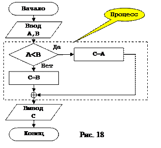 Итак начинаем строить алгоритм решения поставленной задачи, рисунок 18. За основу как обычно берем общую структуру алгоритма, в блок «ввод данных» вводим символическое представление объектов, определенных как исходные данные, в нашем случае это A и B. Далее идет блок выполнения алгоритма. Поскольку поставленная задача может иметь два пути решения, вводим в блок процесса структуру развилки, и записываем в нее условие, которое является причиной различных путей решения, в нашем случае это A<B.Теперь у нас получилось два возможных пути решения, в случае выполнения условия, мы можем организовать один вычислительный процесс, а в случае его невыполнения другой, так и поступаем в случае выполнения условия организуем процесс, в котором будет выполняться шаг, выполняющий действие C=A, а в случае его невыполнения шаг на котором выполняется выражение C=B. После выполнения одного из возможных действий мы объединяем пути и организуем вывод результатов, для этого записываем в блок «результат» символическое название объекта, являющегося результирующим, в нашей задаче это объект C. На этом процесс построения алгоритма решения задачи можно считать завершенным.