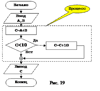 Возможны варианты задач, в которых используется структура развилки, не имеющая шагов, в случае невыполнения условий, например: C=A+B, если C<10, то C=C+10, графическое представление алгоритма приведено на рисунке 19. Как и в предыдущих примерах, определяемся с исходными данными, здесь они имеют символические названия A и B, и с результатами работы алгоритма, это объект, имеющий символическое название C. Теперь рассмотрим непосредственно процесс выполнения алгоритма. У нас имеется два выражения, это C=A+B и C=C+10, однако, первое выражение выполняется всегда, а второе, только при определенных исходных данных, в нашем случае условием C<10. Следовательно, нам необходимо внедрить развилку, но с одним условием, что дополнительный шал алгоритма, появляется только при выполнение условия развилки. В случае его невыполнения, дополнительные шаги не предусматриваются. Итак, анализ задачи проведен, теперь обращаемся к общей структуре алгоритма. В блок «ввод данных», как и в предыдущих примерах вносим список символических представлений объектов, являющихся исходными данным, в блок процесса, первым шагом, вычисление выражения C=A+B, далее идет блок развилки C<10, в случае выполнения которого, вводим дополнительный шаг C=C+10, и последним нашим действием, будет запись в блок «результаты» символического представления результатов работы алгоритма, в нашем случае это объект C. Процесс разработки алгоритма завершен.