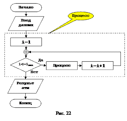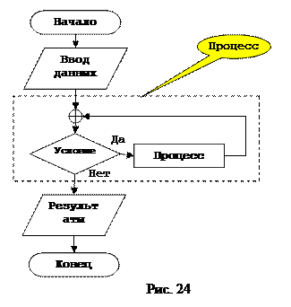 При выполнении циклического процесса, сначала проверяется условие, и если исходные данные заданы таким образом, что Aнач заранее больше Aкон, то при таких исходных данных процесс внутри цикла не выполнится ни разу. Общая структура алгоритма организации цикла с предусловием приведена на рисунке 24.
