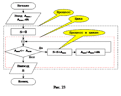 Второй вид циклического процесса, это циклический процесс с предусловием. Этот вид циклического процесса применяется в ситуациях, когда процесс, повторяемый в цикле выполняется только в случае выполнения условия, причем перед началом цикла проверяется истинность этого условия. Цикл со счетчиком является частным случаем цикла с предусловием, однако в структуре цикла со счетчиком, за ранее известно сколько раз будет повторен процесс, а в общем случае цикла с предусловием нет. Цикл с предусловием, может не выполнится ни одного раза, если заранее заданы параметры невыполнимого условия, например, если телефон работает, то набирать номер пока не произойдет соединение. В этом примере видно, что для выполнения цикла должны выполниться условия «телефон работает» и «нет соединения», то есть если телефон не работает или соединение уже установлено цикл не выполниться ни одного раза. Рассмотрим алгоритм включающий в себя цикл с предусловием на примере. Найти сумму цифр от Aнач до Aкон с шагом dA, рисунок 23. Исходными данными для построения алгоритма решения задачи являются Aнач, Aкон и dA. Результатом работы алгоритма будет являться сумма, придадим ей символическое название S. Для решения этой задачи нам необходимо сложить все числа, которые входят в промежуток от Aнач до Aкон с шагом dA, то есть на первом шаге мы присвоим символическому объекту значение ноль S=0, на втором шаге мы прибавим к S=Aнач, далее S=S+dA,…, S=S+dA до тех пор, пока Aнач+n*A будет меньше или равно Aкон. Для того, чтобы не повторять одну и туже операцию некоторое количество раз и организуется цикл с предусловием, который будет выполнять этот процесс автоматически.