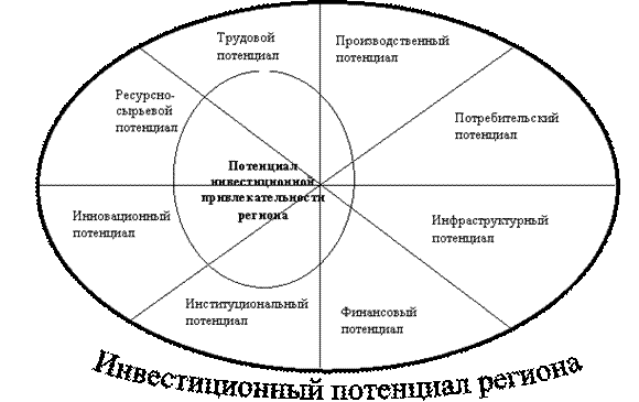 Инвестиционная деятельность невозможна без наличия инвестиционных ресурсов, а также сфер и объектов вложения капитала. В теории инвестиций для обозначения условий имеющих высокую значимость для привлечения инвестиционных ресурсов используют категорию инвестиционного потенциала, который на уровне региона скалывается из восьми частных потенциалов или условий (факторов): ресурсно-сырьевого, трудового, производственного, потребительского, финансового, инфраструктурного, институционального, инновационного.