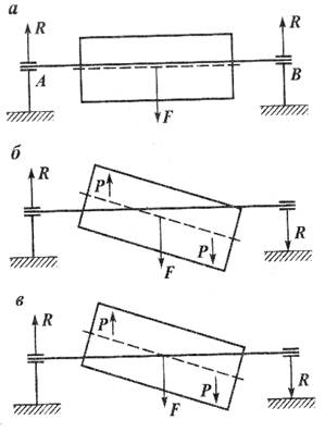 | Рис. 10. Виды неуравновешенности ротора насоса: а – статическая неуравновешенность; б – динамическая неуравновешенность; в – моментальная неуравновешенность; А, В – подшипниковые узлы; R – усилие реакции подшипниковых узлов; F – главный вектор сил инерции; РР – пара сил моментной составляющей неуравновешенности |