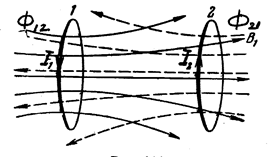 Взаимная индукция. Явление взаимной индукции состоит в том, что при изменении силы тока в каком-либо контуре, в пространстве, окружающем этот контур, возникает переменное магнитное поле, которое индуцирует э.д.с. в соседних контурах. Возьмем два контура 1 и 2 (рис.9.2).