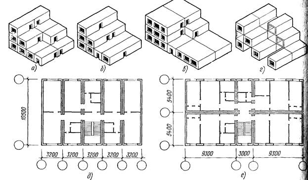 а —из блок-комнат; б — из блоков на ширину здания; в — из блок-квартир; г — из сото-блоков; д здания из блоков на ширину здания; в — план здания из блок-квартир