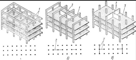а — рамная; б — рамно-связевая; в — связевая; 1 — ригели; 2 — вертикальные связи жесткости; 3 — жесткий диск перекрытия