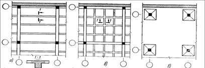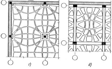 а — с главными и второстепенными балками (ребрами); 6 — с балками перекрестного направления и ребрами кессонного типа; в — безбалочное перекрытие с колонной, имеющей капитель; г — безбалочное перекрестного направления и ребрами по линиям равных моментов; д — то же, с балками