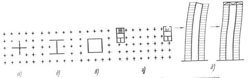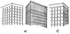 Пространственное ядро жесткости работает как консоль, заделанная посредством фундамента в грунт. Воспринимая значительные ветровые нагрузки при повышенной этажности здания, оно может подвергаться изгибу, нарушая горизонтальность этажей и вызывая деформации в навесных панельных стенах. Чтобы уменьшить указанные деформации, в пределах верхнего технического этажа устраивают жесткие конструкции рамного типа (рис. 2, д).