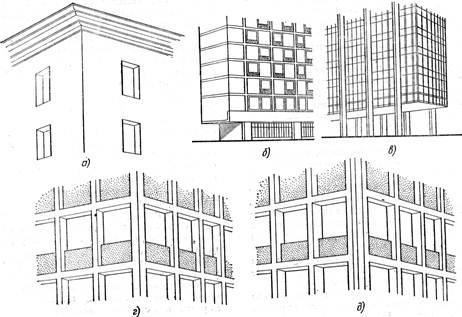 Модульная фасадная сетка каркасных зданий достаточно монотонна и поэтому должна быть четко решена у своих границ: на углах, в первом и верхнем этажах, чтобы здание не казалось фрагментом, а было законченным целым. Особенно сложно решение угла. Необходимо подчеркнуть различное значение угла в зданиях с несущими стенами и каркасных. В первом случае угол, т. е. пересечение продольной и поперечной стены, является важным элементом жесткости и устойчивости всего здания. Поэтому он делается массивным, тщательно соблюдается перевязка швов кладки.