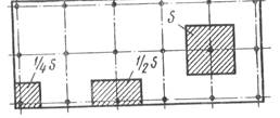 Загруженность колонн каркасного здания (заштрихованы площади перекрытий, с которых нагрузка передается на внутреннюю, наружную рядовую и угловую колонны)