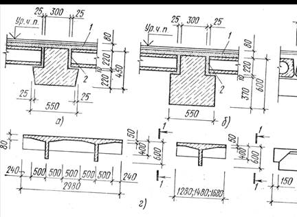 а — опирание на ригель многопустотных плит длиной 3 и 6 м; б — то же. длиной 7,2 и 9 м; в — опирание ригеля на консоли колонн; г — T- и 2Т-образные плиты перекрытий; 1 — конструкция пола; г — бетон замоноличивания; 3 — связевая плита перекрытия