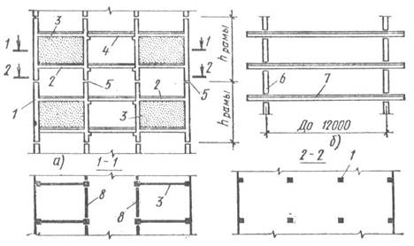 а — с применением Н-образных рам высотой на два этажа; и- с поэтажной установкой колонн; 1 — стойка рамы; 2 — ригель рамы; 3 — поперечная стенка жесткости (изготавливается вместе с рамой); 4 — отдельно монтируемый ригель; 5 — стык Н-образных рам; 6 — колонна, устанавливаемая на ригель; 7 — ригель с двумя консолями; 8 — продольная стенка жесткости