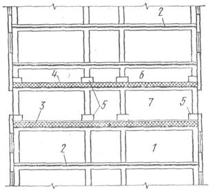 1 — этаж; 2 — междуэтажное перекрытие; 3 — утепленное и водонепроницаемое перекрытие (типа крыши-террасы); 4 — утепленное перекрытие; 5 — утепление колонн; 6 — технический этаж; 7 — открытый этаж