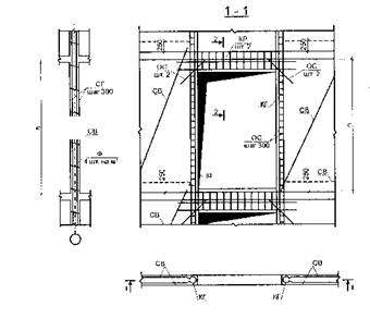 Плоская плита перекрытия высотой в 400 мм представляет собой систему перекрестных балок (ребер) с уложенными между ними вкладышами из теплоизоляционных материалов (пенополистирол, минераловатные плиты и пр.). Верхняя (толщиной 60 мм) и нижняя (толщиной 50 мм) плоскости плиты связаны между собой ребрами. Верхняя и нижняя плоскость плиты армируется конструктивными сетками, а ребра - сварными или вязаными каркасами. По осям колонн располагают основные балки шириной порядка 400 мм и армируют рабочей арматурой. Второстепенные (дополнительные) балки, идущие с шагом 600 мм, имеют ширину 120-150 мм, их армирование конструктивное.