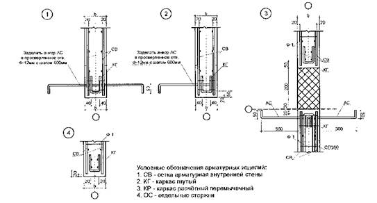 По краям стен и проемов устанавливают вертикальные каркасы или гнутые стержни, приваренные к вертикальным сеткам. Гнутые стержни располагают и в местах пересечений стен. При процессе возведения стен соблюдают непрерывность армирования.