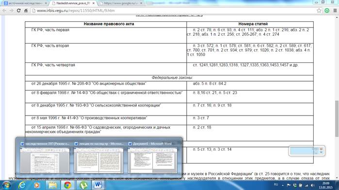 Сказанное выше проиллюстрировано в табл. 1. В ней указаны номера статей, регулирующих наследственные правоотношения, в частях первой, второй и четвертой ГК РФ, федеральных законах.