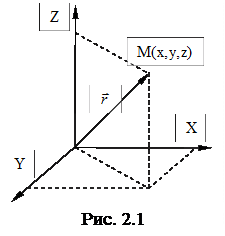 В качестве тела отсчета часто используется Земля или предметы и сооружения, находящиеся на Земле. В качестве системы координат чаще всего используют прямоугольную декартову систему координат XYZ, связанную с какой-либо точкой «О» земной поверхности. Тогда положение материальной точки М в любой момент времени определяется координатами xyz (рис. 2.1).