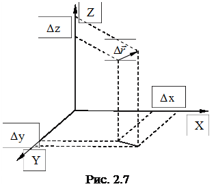 Если рассматривать движение в пространстве, то величину и направление вектора скорости можно представить через проекции этого вектора на направления осей x, y, z (рис. 2.7).