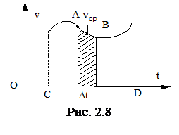 За малый промежуток времени Dt перемещение графически изображается в виде прямоугольника, высота которого равна некоторому значению средней скорости v (рис.2.8). Тогда для любого промежутка времени от 0 до t суммируют все эти элементарные площадки SDS, т.е. графически эта сумма представляет собой площадь фигуры ABCD (Svср.×Dt). Чаще всего площадь фигуры дает нам также путь, пройденный при неравномерном движении (математически это записывается как предел).