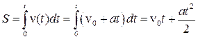 Данная формула верна, если за время движения знаки начальной скорости и ускорения совпадают. Наклон прямой v0+at на рисунке 2.10 зависит от величины «а», чем «а» больше, тем больше угол наклона. «S» численно рано площади заштрихованной фигуры.