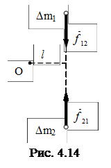 ПОЯСНЕНИЕ: Рассмотрим две любые элементарные массы Dm1 и Dm2. Силы, с которыми они взаимодействуют, лежат на одной прямой (рис. 4.14). Их моменты относительно произвольной точки “O” равны по величине и противоположны по направлению. Поэтому моменты внутренних сил попарно уравновешивают друг друга и сумма моментов всех внутренних сил для любой системы материальных точек, в частности для твердого тела, всегда равна нулю. Это утверждение справедливо как для суммарного момента всех внутренних сил, взятого относительно любой точки, так и для суммарного момента этих сил, взятого относительно любой оси.