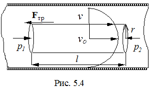 При движении жидкости в круглой трубе ее скорость равна нулю у стенок трубы и максимальна на оси трубы. Полагая течение ламинарным, найдем, как меняется скорость в направлении радиуса трубы. Выделим в трубе воображаемый цилиндрический объем жидкости радиуса r и длины l, соосный с трубой (рис. 5.4). При стационарном течении жидкости сила трения Fтр равна разности сил давления: