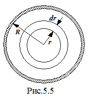 Формула (5.10) показывает, что скорость частиц как функция расстояния от оси трубы изменяется по параболическому закону. Используя формулу (5.10), можно решить такую важную практическую задачу, как нахождение объема жидкости Q, протекающего через поперечное сечение трубы за единицу времени. Разобьем поперечное сечение трубы на кольца шириной dr (рис. 5.5). Через кольцо радиусом r за секунду пройдет объем жидкости, равный произведению площади кольца 2prdr на скорость течения в точках, находящихся на расстоянии r от оси трубы: