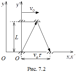 = 2L /с. Если эти часы движутся со скоростью v o вдоль оси x (рис. 7.2), то для неподвижного наблюдателя траектория движения луча выглядит в виде зигзага и расстояние, пройденное светом за период часов t, будет более длинным, его квадрат равен 4L2 +
