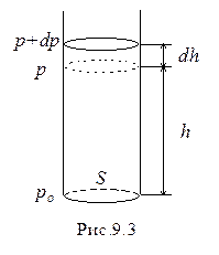 Давно известно, что давление газа над поверхностью Земли уменьшается с высотой. Атмосферное давление на некоторой высоте h обусловлено весом вышележащих слоев воздуха. Пусть на высоте h давление равно p. Тогда на высоте h + dh давление будет равно p + dp (рис.9.3). Разность давлений dp = dF/S, где dF = rSdhg вес столба воздуха в объеме Sdh, S - площадь основания цилиндра, r - плотность воздуха, g - ускорение земного притяжения. Отсюда получим